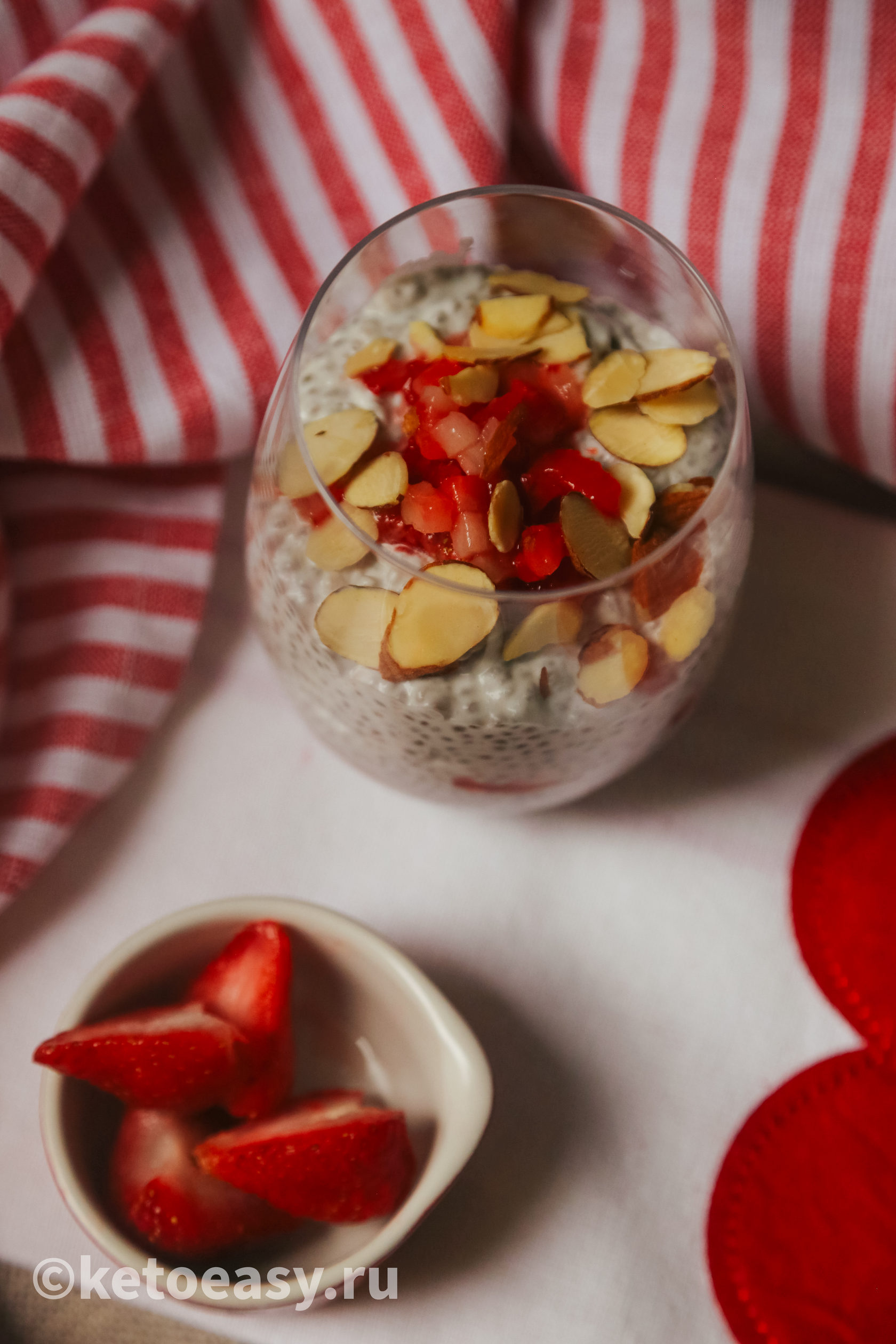 Перед подачей добавляю стевию и ягоды. Я выложила десерт слоями с порезанной клубникой слайсами, сверху украсила остатками клубники и миндальными лепестками